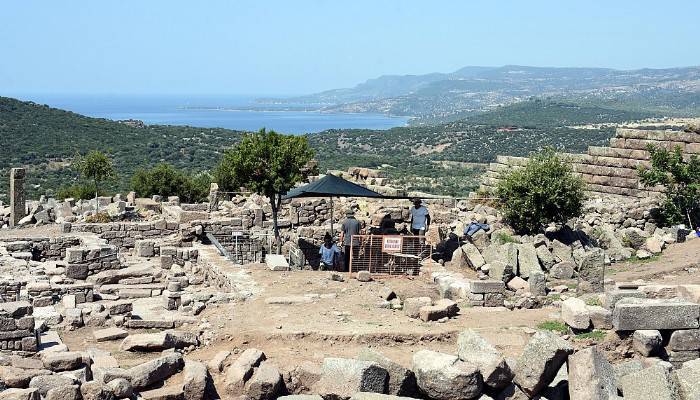 Antik dönemin önemli liman kenti Assos'ta kazı çalışmaları Çanakkale Onsekiz Mart Üniversitesi (ÇOMÜ) Fen-Edebiyat Fakültesi Arkeoloji Bölümü öğretim üyesi Prof. Dr. Nurettin Arslan başkanlığında, 45 kişiden oluşan ekip ile devam ediyor. Geçen yıl bulunan antik kentin Batı kapısı yakınındaki han kompleksi ve depremde yıkılmış bir yapıda bu yılki kazı çalışmaları devam ederken, kentin Batı kapısı girişindeki taş kaplı caddede günümüzden yaklaşık 2 bin yıl öncesine ait bronz bir kalem ile şans oyunlarında kullanılan ortası daire şeklinde oyuk kemikten yapılmış bir zar bulundu.